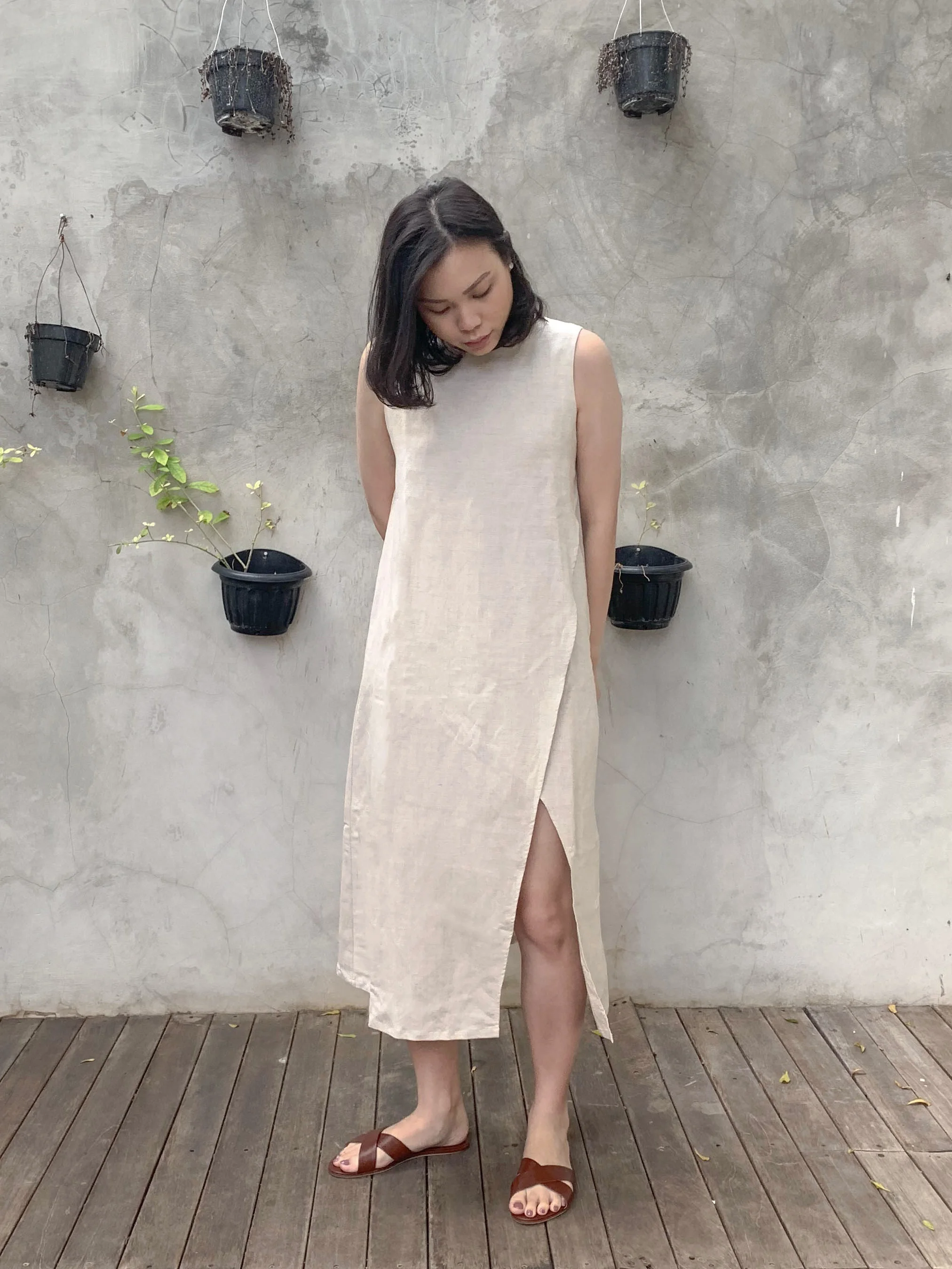I chose to wear this dress to my friend’s holy matrimony in Bali (dress it up with some nude kitten heels). The fit is very relaxing, the linen-rayon material combination is very cooling and comfortable to the skin, and the slit is the perfect addition to show off some legs (without being too much).